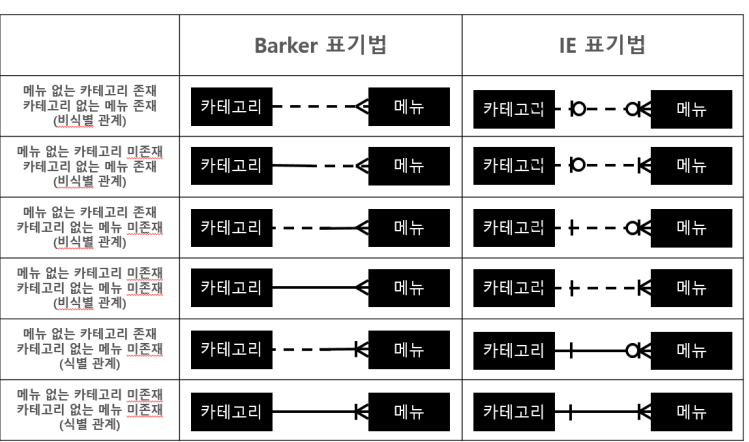 - ERD 표기방식: 식별→실선(강한 연결관계), 비식별→점선(약한 연결관계)
