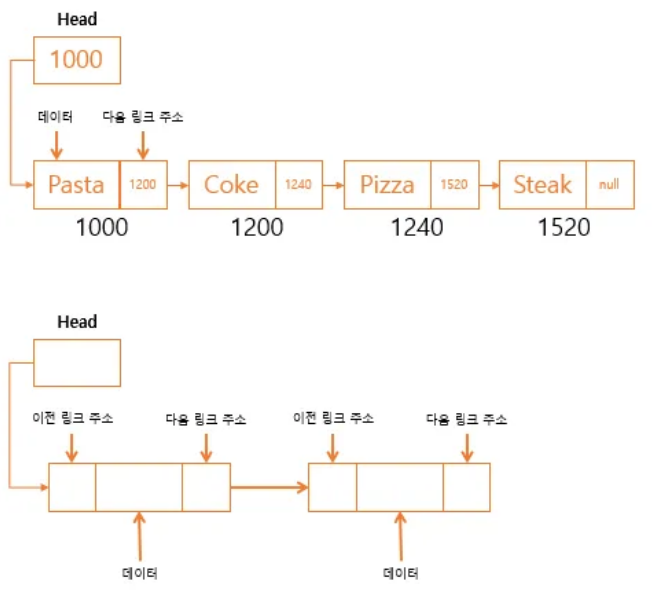 - 이중 연결 리스트: 단일 연결 리스트는 다음 요소만 링크하는 반면 이중 연결 리스트는 이전 요소도 링크하여 이전 요소로 접근하기 쉽게 고안된 자료구조 이다.