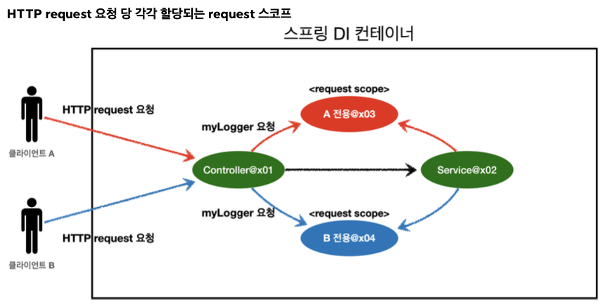 - 로그를 출력하기 위한 MyLogger 클래스를 request 스코프로 지정