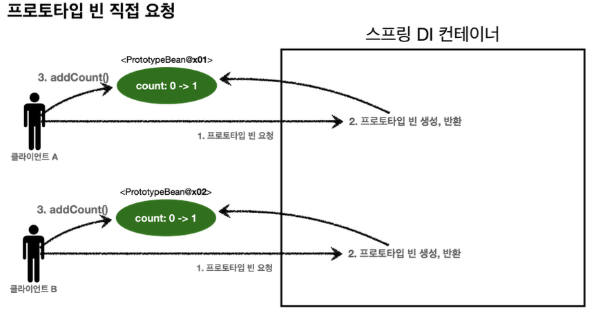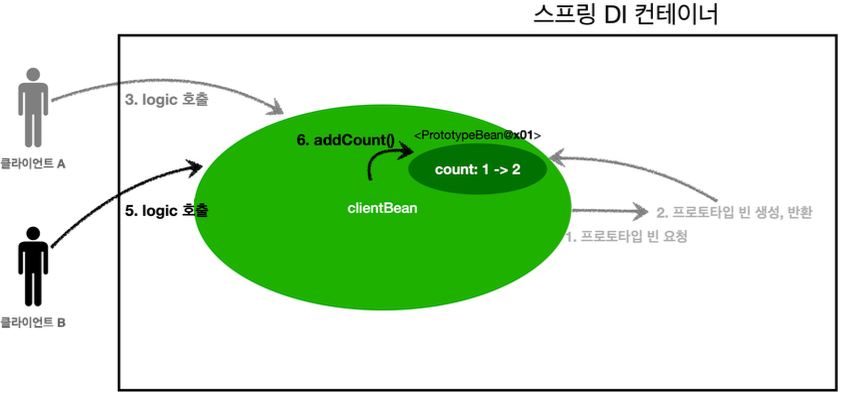 - 클라이언트에 빈을 반환하고, 이후 스프링 컨테이너는 생성된 프로토타입 빈을 관리하지 않는다.