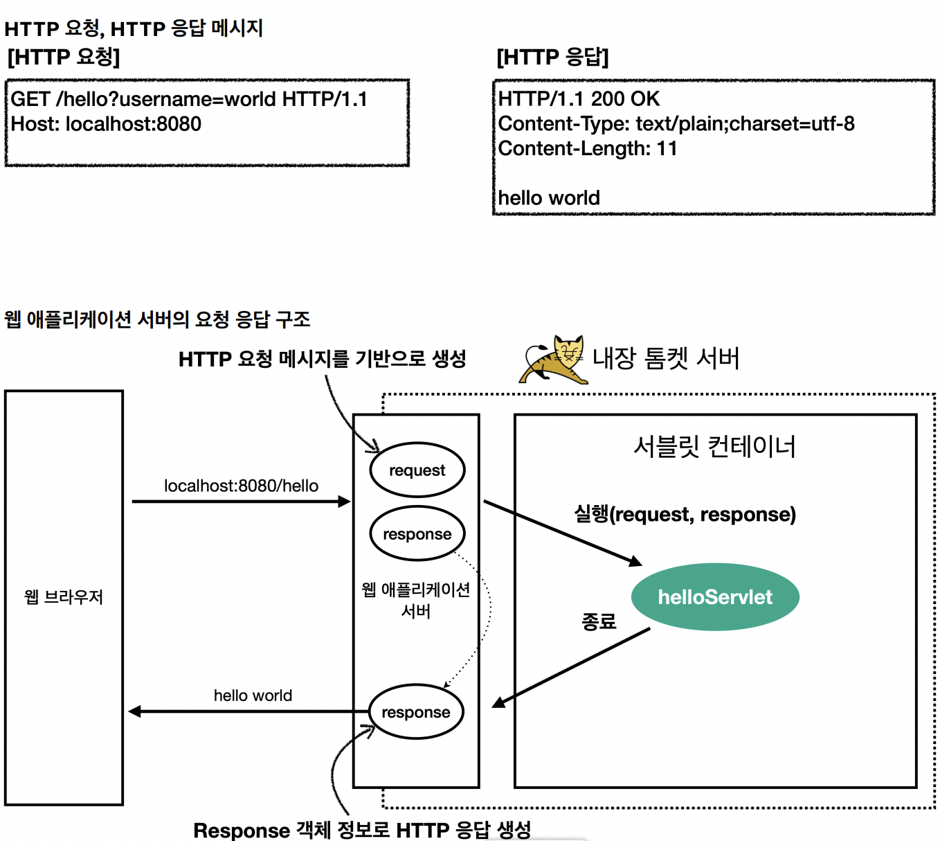 -> 서버에서 HTTP 요청 메시지를 기반으로 request, response 객체 생성