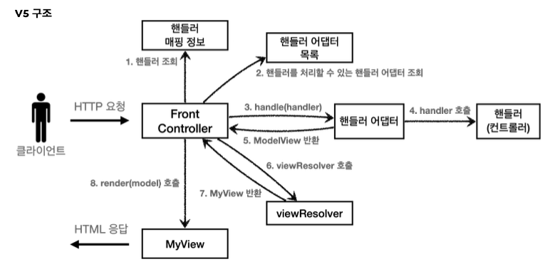 - 원래는 컨트롤러 호출 및 리턴값 처리를 프론트 컨트롤러에서 담당했으나, 컨트롤러마다 파라미터 및 리턴 값이 제각각이기 때문에 각 컨트롤러에 맞는 어댑터를 각각 생성하여 이 과정을 위임하고 프론트 컨트롤러는 모든 컨트롤러에 공통적인 부분만 수행한다.