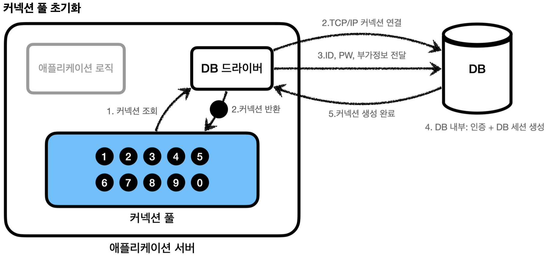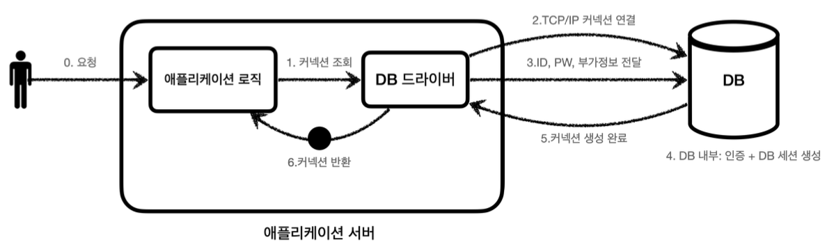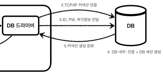 - 애플리케이션 서버와 데이터베이스 간의 통신을 통해 커넥션을 새로 만드는 과정은