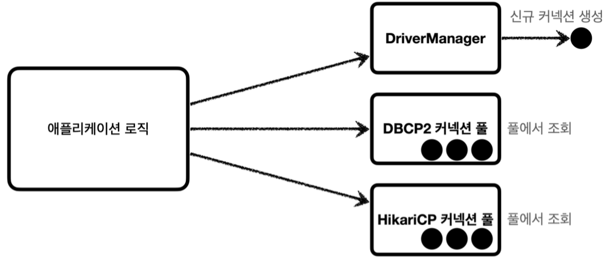 - 만약 애플리케이션 로직에서 DriverManager를 사용해서 커넥션을 획득하다가 HikariCP같은 커넥션 풀을 사용하도록 변경하면