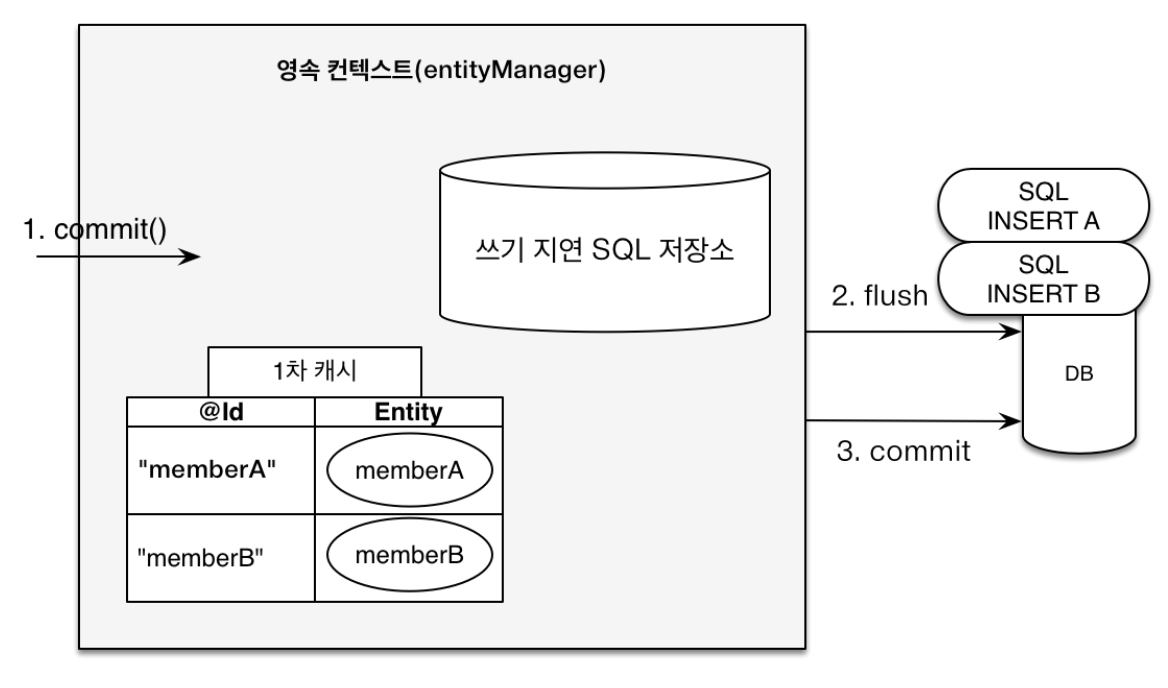 - 쓰기 지연 SQL 저장소에 “이 member를 DB에 insert 해야 한다"는 정보를 임시로 보관