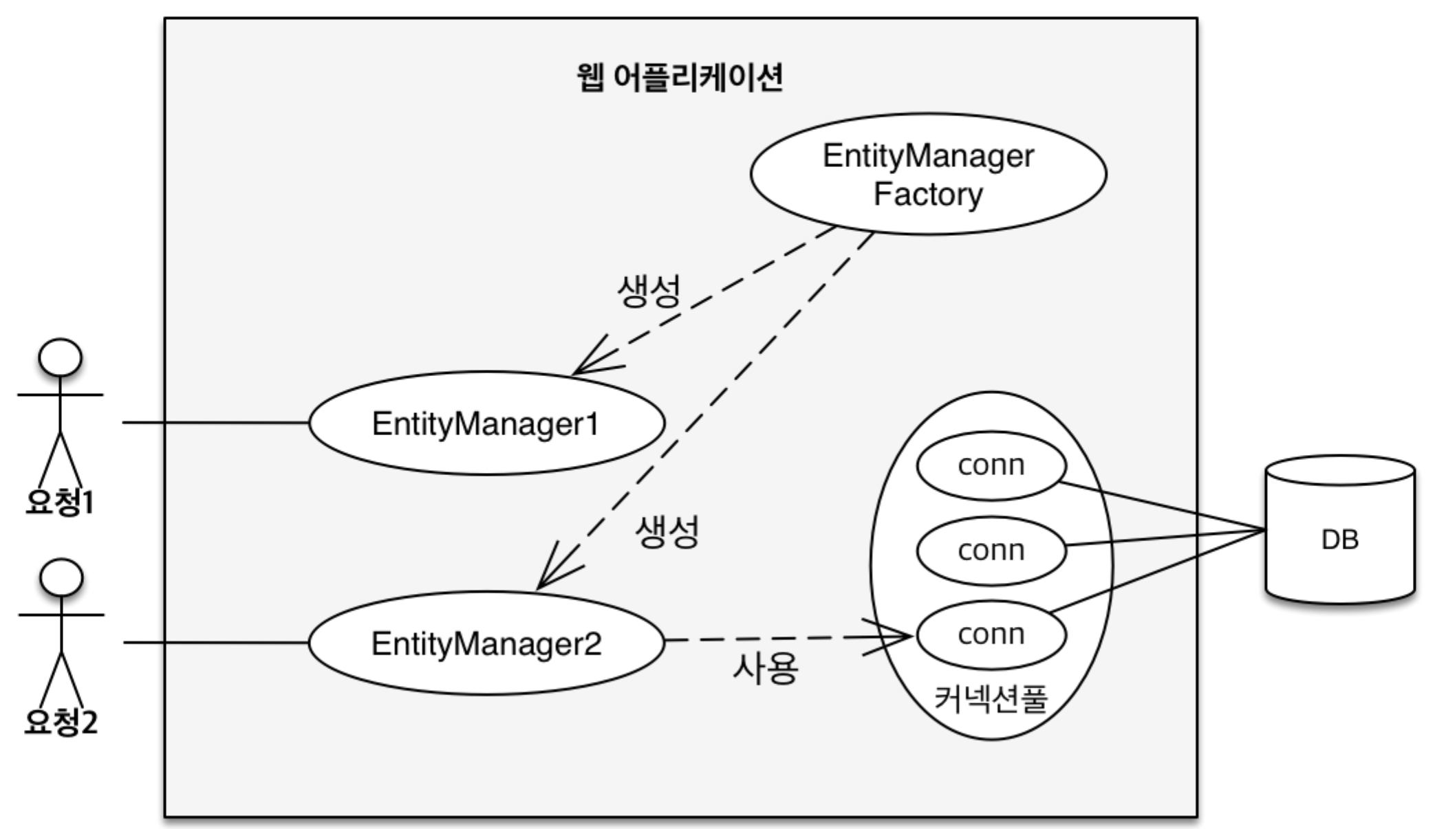 - J2SE 환경: EntityManager : 영속성 컨텍스트 = 1:1