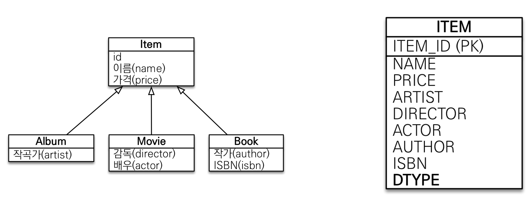 - @DiscriminatorColumn(name = "DTYPE"): 부모 테이블에 자식 타입을 구분하는 컬럼 지정 (기본 컬럼명 DTYPE)