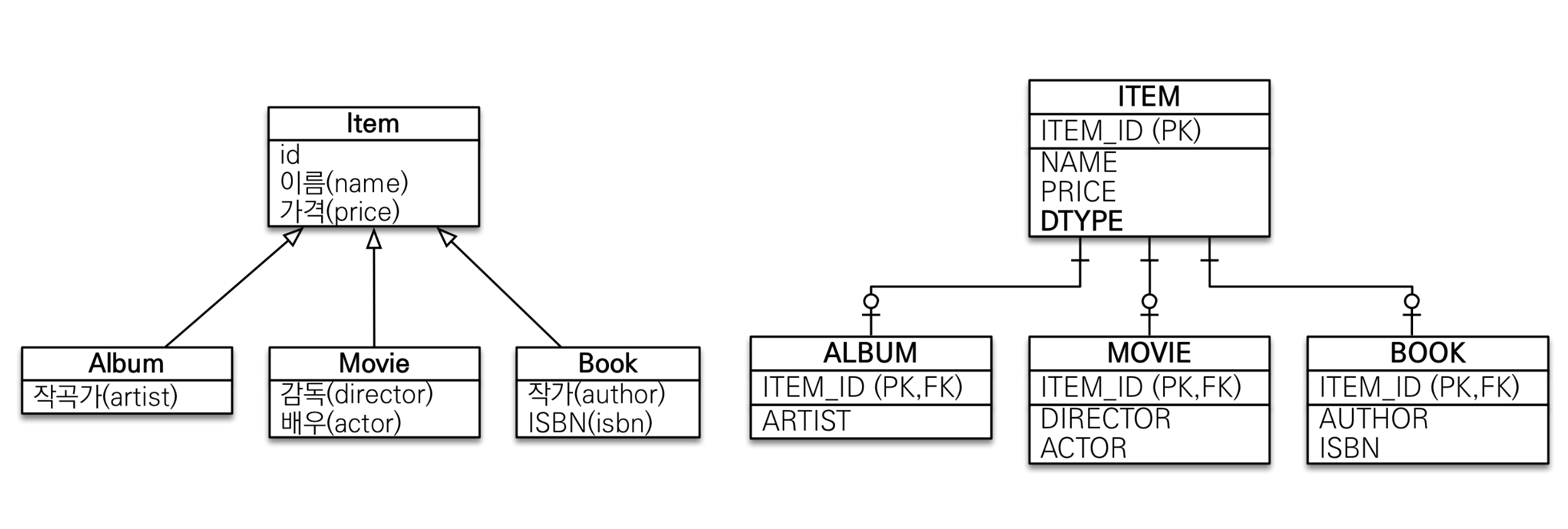 - JPA에서는 객체의 상속 구조를 DB의 슈퍼타입-서브타입 관계로 매핑하는 것을 상속관계 매핑이라 함
