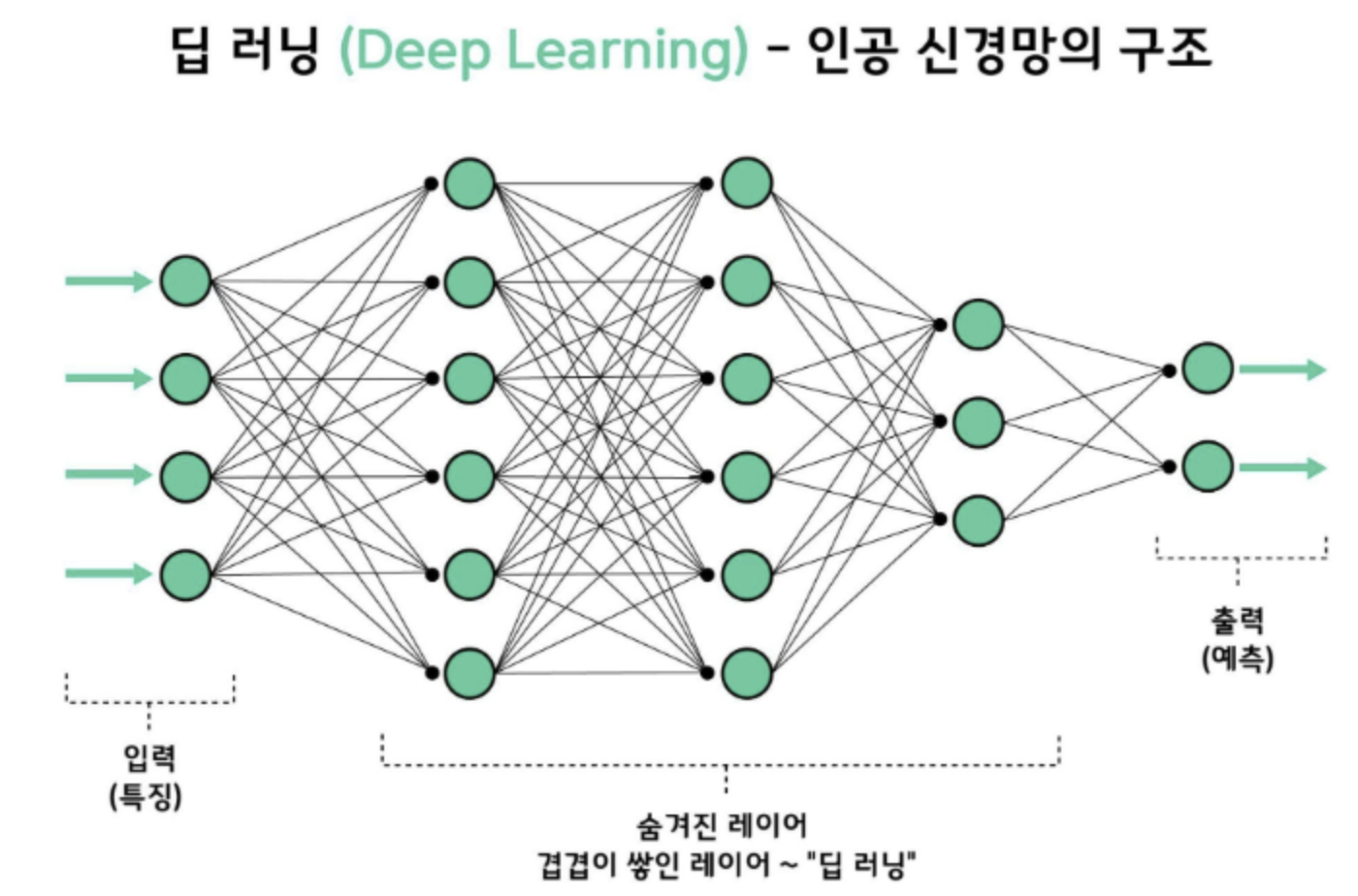 | 은닉층(Hidden Layer) | 가중치·편향·활성화 함수로 데이터 특징 추출 |