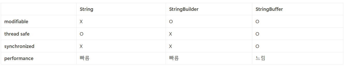 - String은 불변하기 때문에 값을 변경할 수가 없음 -> 이를 해결하기 위해서 StringBuffer와 StringBuilder가 등장