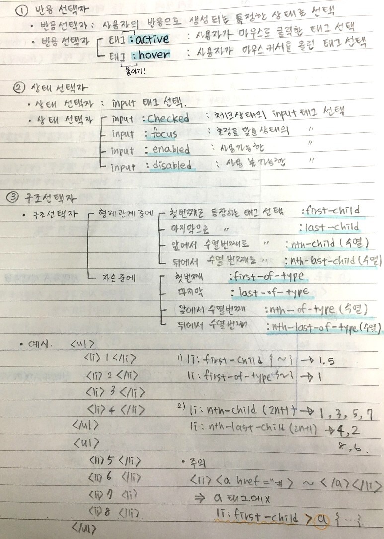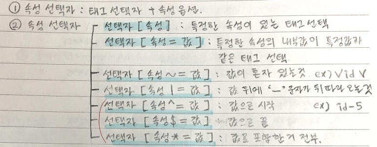 - 태그 선택자와 클래스 선택자: 여러 li 태그 중 속성으로 select 클래스를 갖는 태그 선택 -> li.select