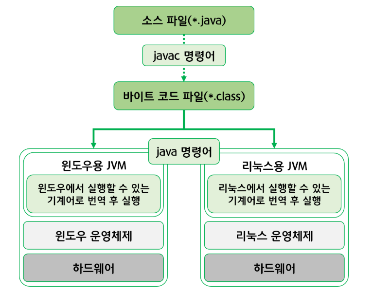 - 이때, 자바는 소스 코드를 바이트 코드로 변환하여 플랫폼에 독립적인 형태로 만듭니다.