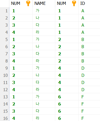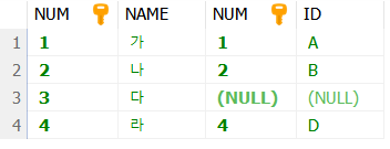 ON t1.num = t2.num; -- USING(num) 컬럼명이 같을 경우 USING 사용가능